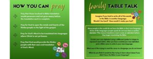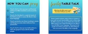 ENGAGE – Engage with family and friends about Bible translation around the world and the Himba people. Be sure to use the Family Table Talk topics on the back of each week’s prayer card!