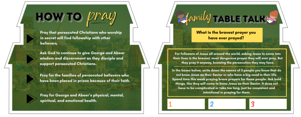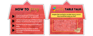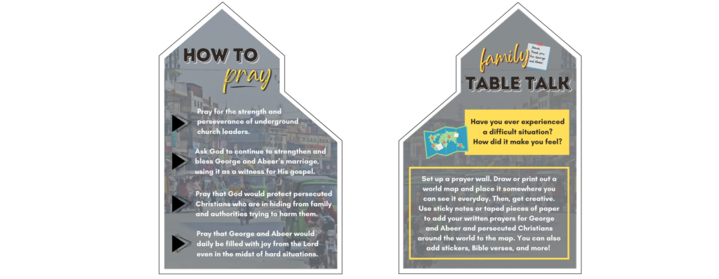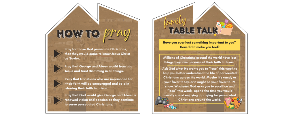 ENGAGE – Engage with family and friends about persecuted Christians around the world and the work George and Abeer are doing. Use the Family Table Talk topics on the back of each week's prayer card!
